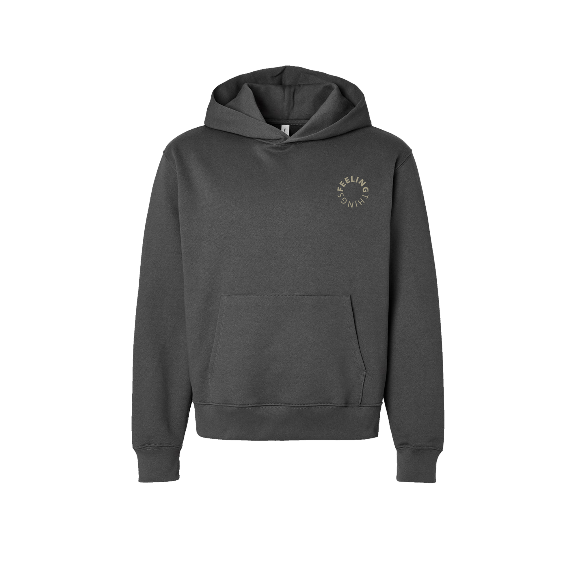 Unisex granite hoodie with Feeling Things circle artwork in taupe on the front chest. Can be purchased as a set with the Feeling Things Sweats, each sized separately).